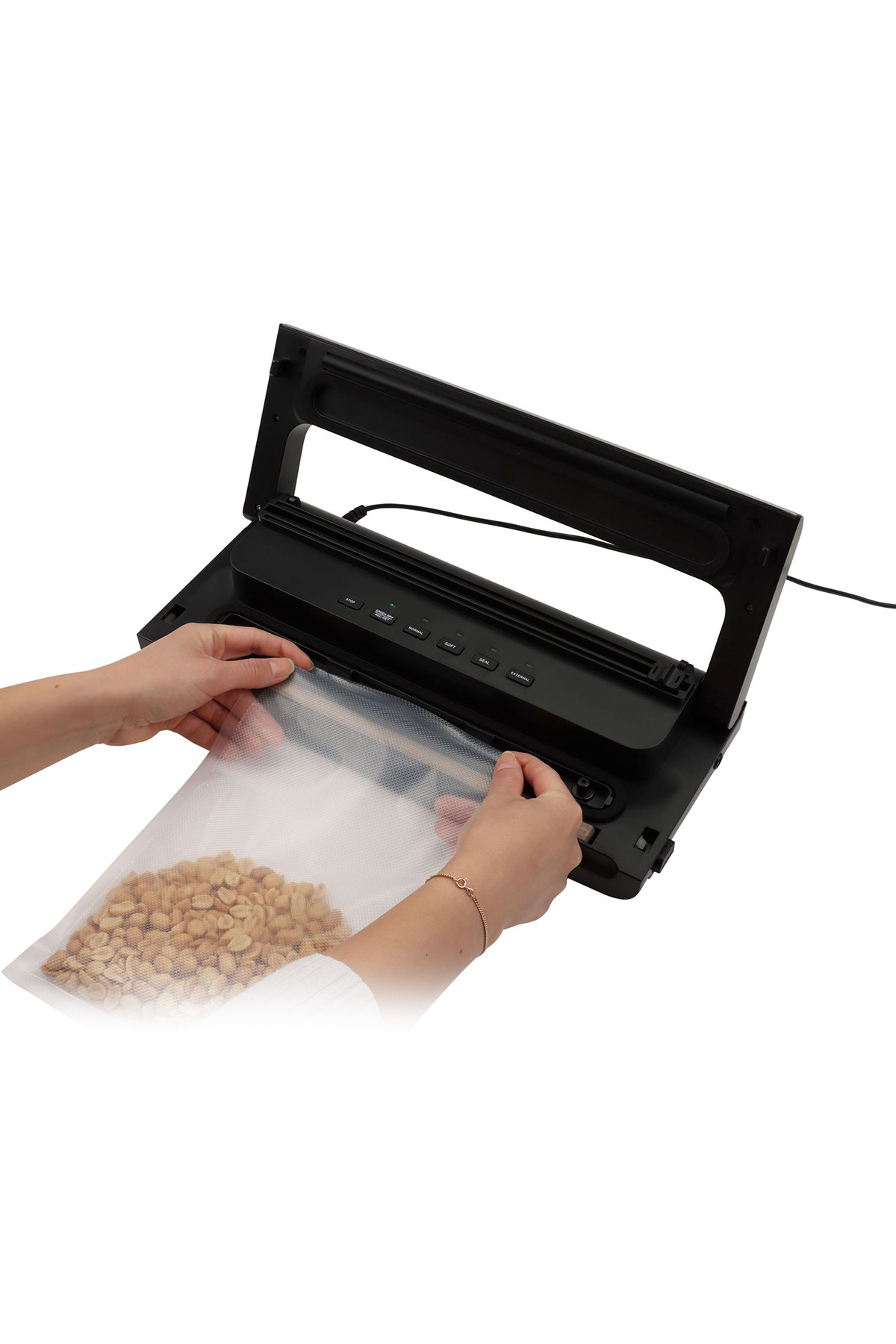 Şişeleri ve kapları vakumla kapatmak için hortum bağlantısı ve 5 adet hediye vakum torbası (20x30 cm) ile birlikte gelir.